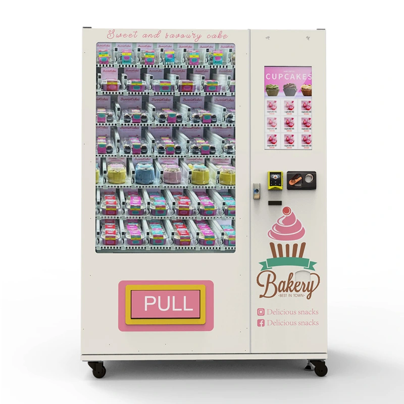 Refrigerated Elevator Cake Vending Machine für Cupcakes, Salate, Sushi und frische Lebensmittel. Mit Kompressor-Kühlung, Touchscreen, mehreren Zahlungsoptionen, Wi-Fi, 4G LTE und automatischer Bestandsüberwachung. Ideal für professionelle Selbstbedienungsprojekte.